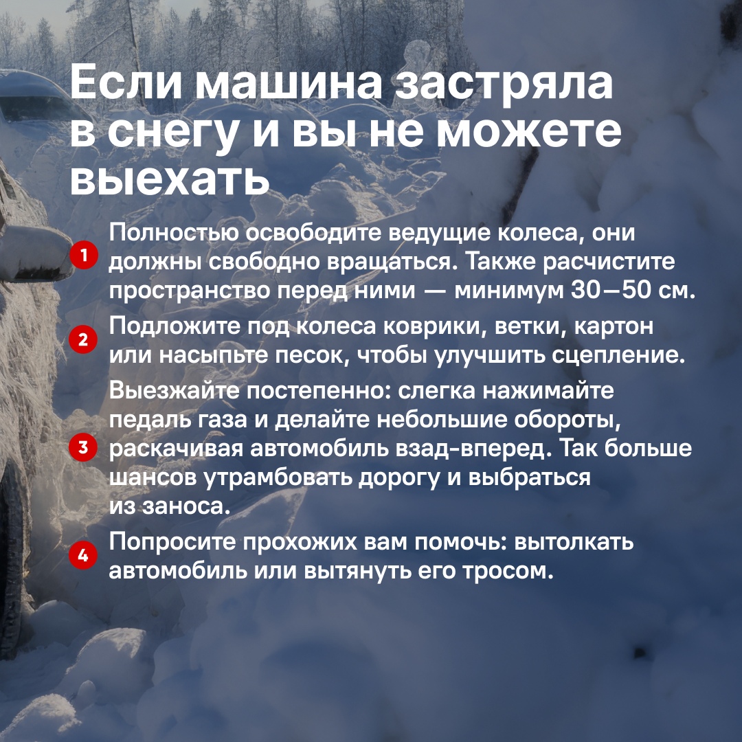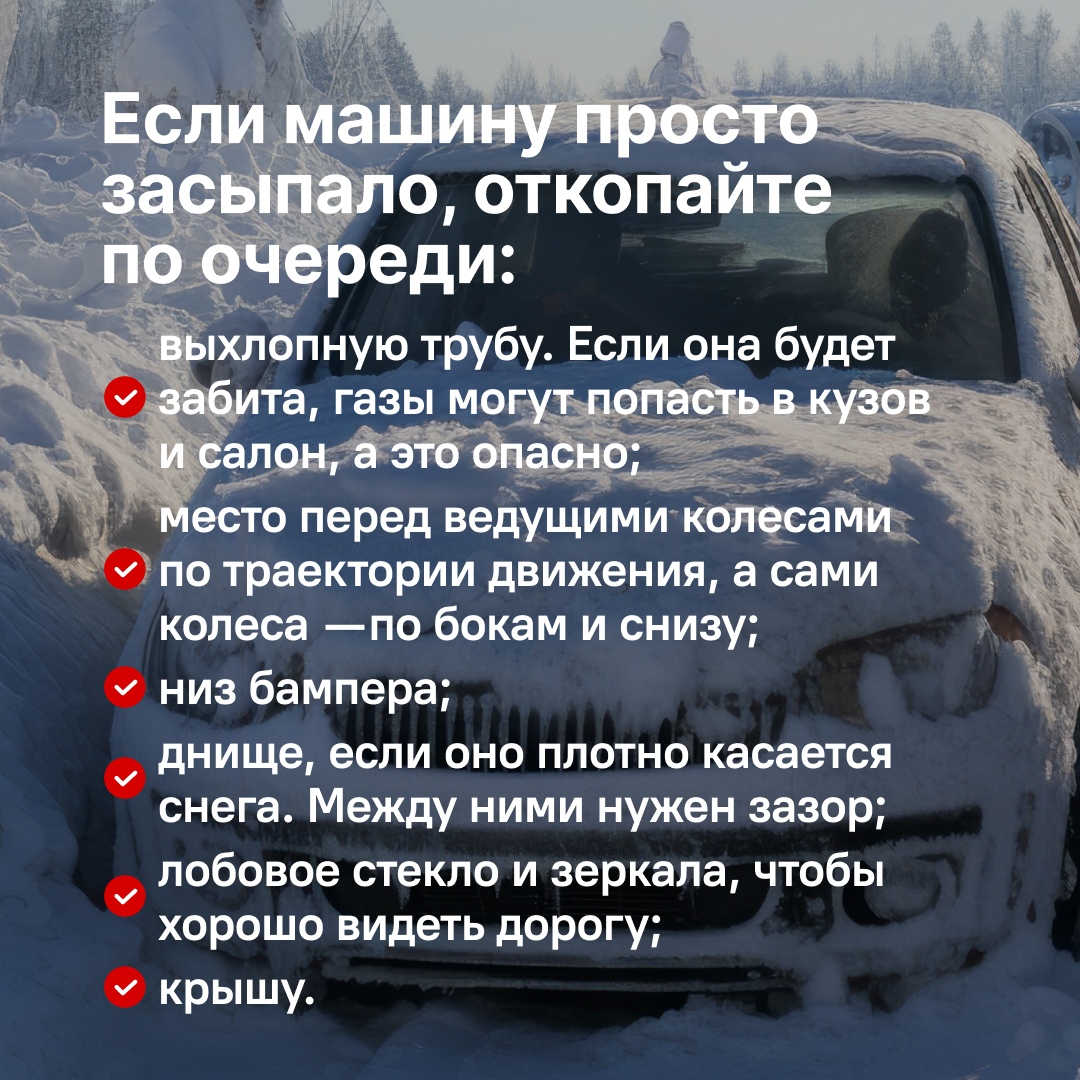 Снегопад — не повод паниковать Когда за ночь выпадает много снега, утром многие автомобили оказываются в плену сугробов. Спешка и неправильные действия могут привести к поломкам и лишним тратам. В карточках собрали простые и безопасные шаги, которые помогут откопать машину без вреда для себя и автомобиля.